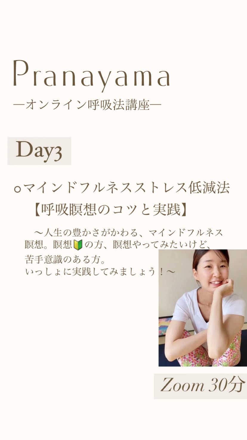 この講座では、全3回に渡って、呼吸のからだと心への作用を楽しく理解しながら、毎日のメンタル&からだのケアとして、すぐに役立てていただけるよう、いっしょに実践していきます。