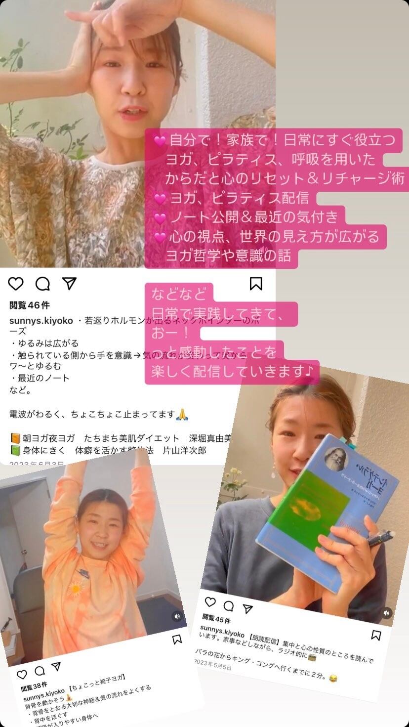 からだや気持ちがホッとゆるむ セルフケア配信や、呼吸法などの、からだを感じる時間と、ヨガ哲学や量子力学、宇宙の法則などから、世界が広がる、意識やこころの仕組みの話、実践してみての気付きや変化のシェアをInstagram専用アカウントで、楽しく、配信しています。